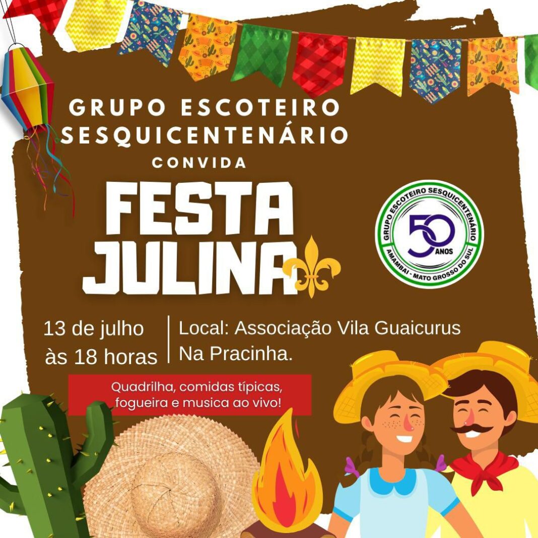 O Grupo Escoteiro Sesquicentenário realiza no dia 13 de julho, uma tradicional Festa Julina. O evento será realizado na Associação da Vila Guaicurus, na Pracinha, a partir das 18 horas.