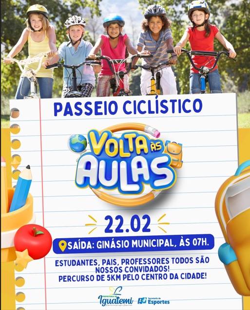 Com o objetivo de incentivar os estudantes a praticarem o ciclismo, pois além de proporcionar uma melhor qualidade de vida, ajuda no condicionamento físico. A Prefeitura de Iguatemi, através da Secretaria Municipal de Esportes, realizará no sábado 22 de fevereiro, o “1º Passeio Ciclístico Volta às Aulas”. A atividade, certamente proporcionará uma grande interação entre Estudantes, Pais, Professores e Educadores em geral. Haverá sorteio de brindes para os participantes.