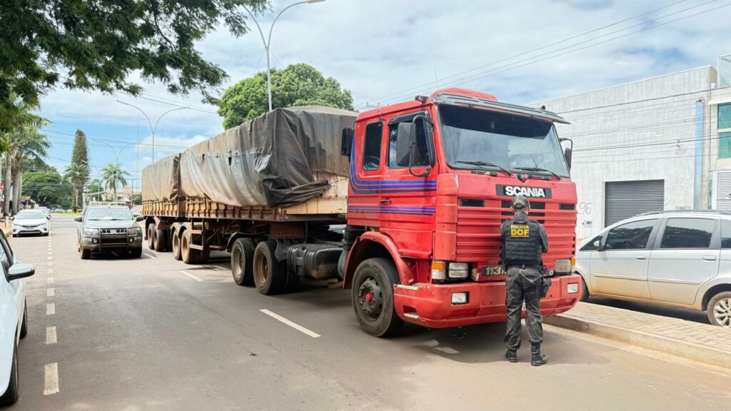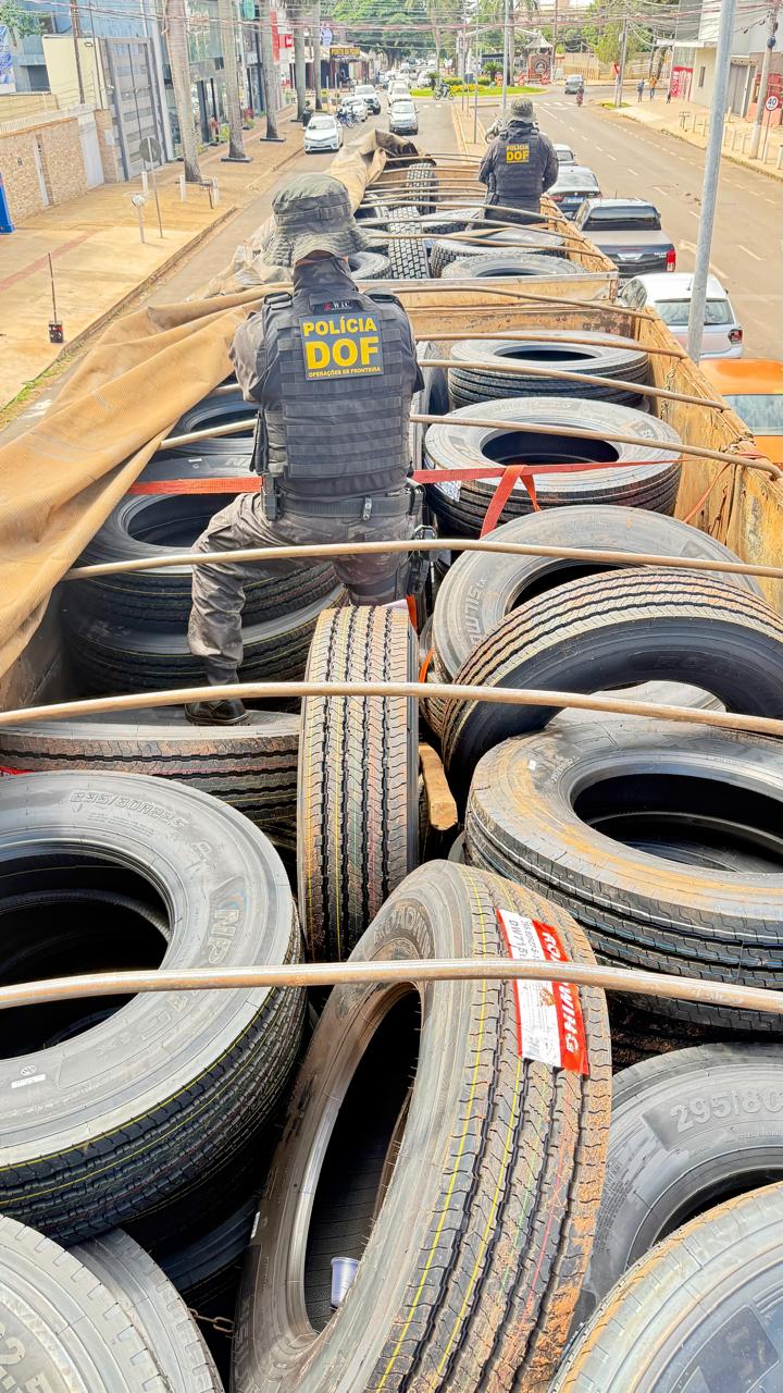 Os policiais faziam bloqueio na MS-156, zona rural do município, quando abordaram o condutor da carreta. Durante entrevista, ele afirmou que estaria carregado com pneus de origem estrangeira.