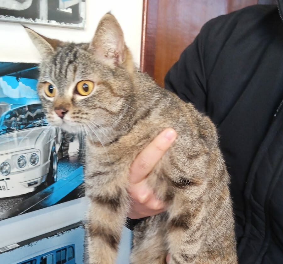 O felino, que está seguro no posto, é manso, de pelagem rajada e aparenta ser bem cuidado e limpo, o que indica que provavelmente pertence a uma família.