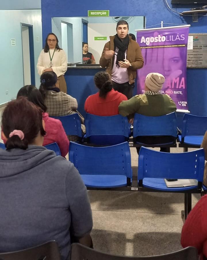 Na manhã desta quarta-feira (27), no Posto de Saúde do bairro Fleck, o CREAS, através do psicólogo Giovani Monteiro e a assistente social Mirela Rebouças, realizou orientações sobre o Agosto Lilás para os atendidos da unidade.