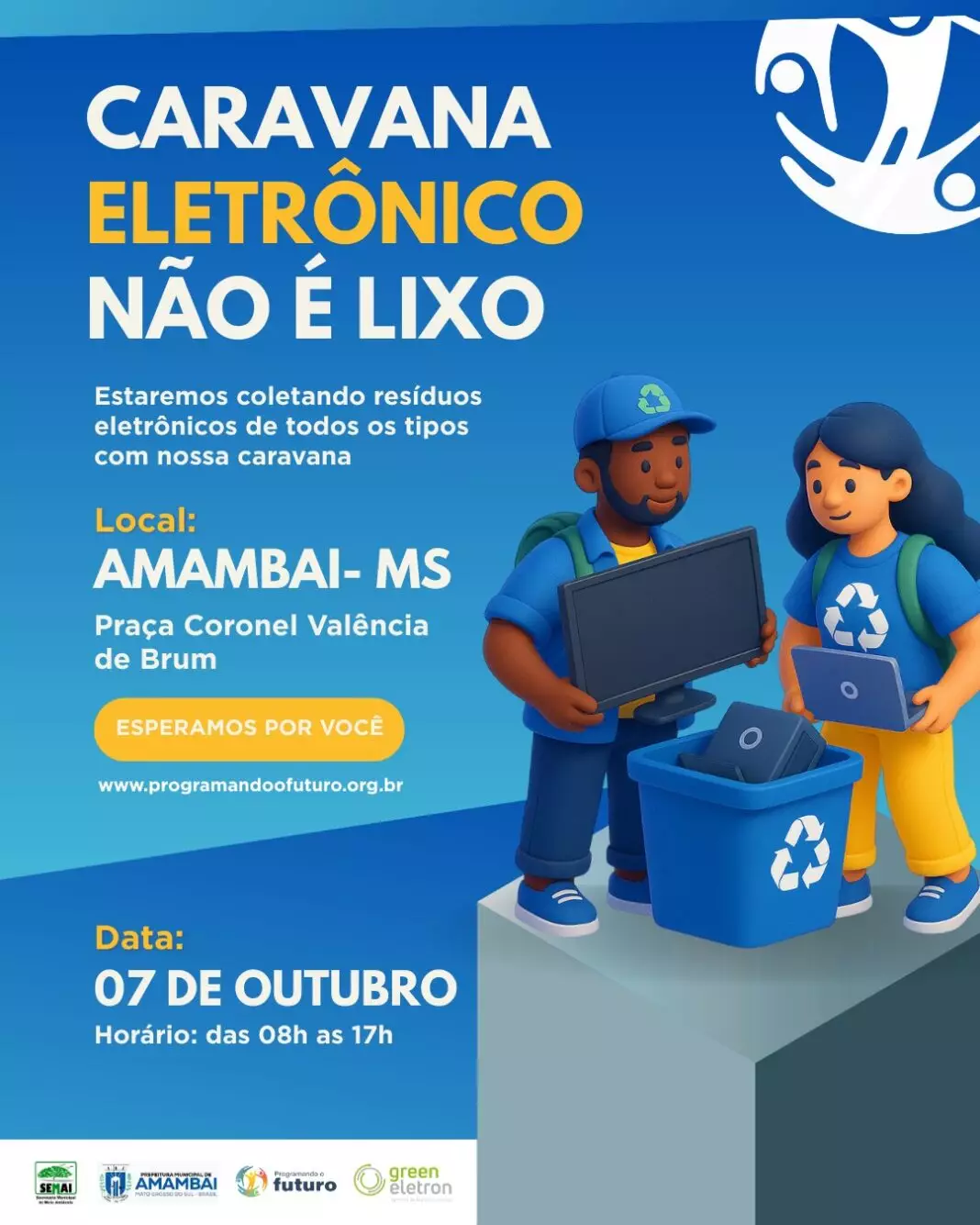 Na terça-feira, 07 de outubro, Amambai recebe a Caravana “Eletrônico não é lixo”, uma ação voltada para o descarte correto de resíduos eletrônicos. A iniciativa acontece na Praça Coronel Valêncio de Brum, das 08h às 17h, e vai recolher todo tipo de material eletrônico que não tem mais uso, como televisores, computadores, notebooks, celulares, impressoras, cabos, pilhas, baterias e muito mais.