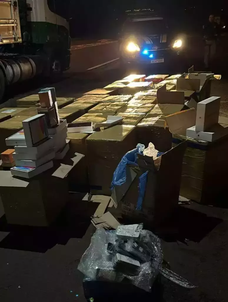 Durante a vistoria da carga, a PRF identificou 42 caixas com equipamentos eletrônicos, contabilizando 1.228 iPhones, 388 MacBooks, 500 smartphones Redmi 14C, 404 smartphones Realme C75, 288 smartphones Poco, 77 relógios Garmin, 56 canetas Apple, 30 iPads, 20 fones de ouvido Apple, 20 Tags Apple e 4 relógios Apple. Além disso, foram encontradas duas meias caixas com perfumes diversos e mais duas caixas com equipamentos de informática diversos.