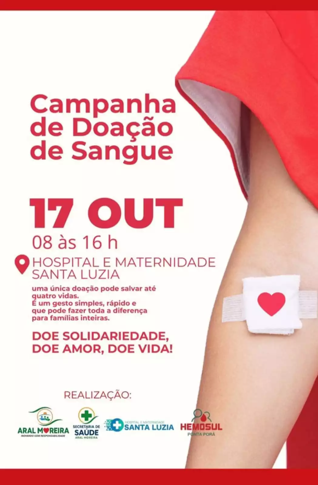A Prefeitura de Aral Moreira, por meio da Secretaria Municipal de Saúde, realiza nesta sexta-feira, 17 de outubro, uma Campanha de Doação de Sangue no Hospital e Maternidade Santa Luzia. A ação acontece das 8h às 16h e conta com o apoio do Hemosul de Ponta Porã.