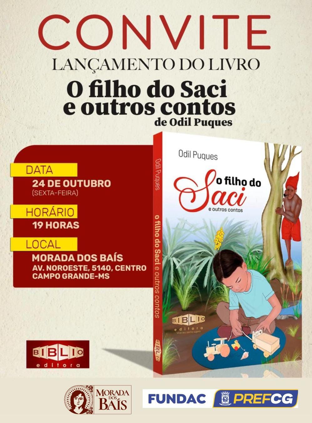 O escritor sul-mato-grossense Odil Puques lança nesta sexta-feira, 24 de outubro, seu novo livro “O filho do Saci e outros contos”, em evento que será realizado na Morada dos Baís, em Campo Grande, a partir das 19 horas.