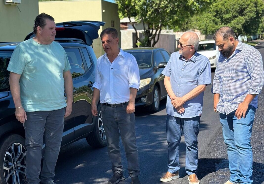 A comitiva formada pelo Prefeito Dr. Lídio Ledesma, pelo Vereador Genésio e pelo Subsecretário de Governança do Ministério da Agricultura, Raul Amaducci, acompanhou a obra de recapeamento na Rua José Caprioli, na Vila Rosa, realizada com o apoio de emendas parlamentares destinadas pelo senador.