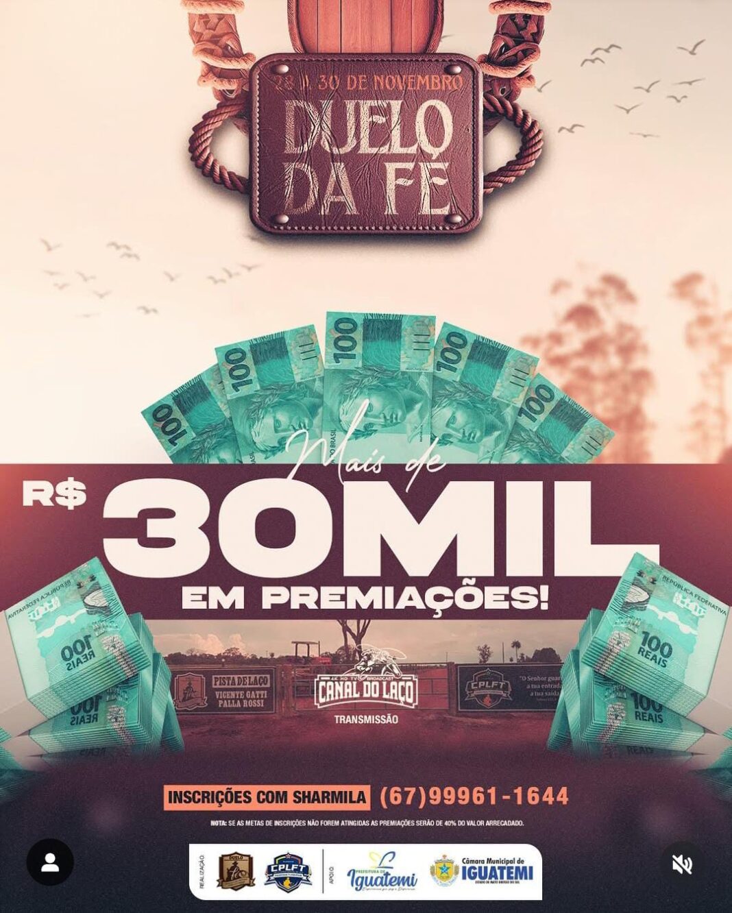 Neste final de semana, com início na sexta-feira (28) de novembro e encerramento no domingo (30), a Fazenda Tuneiras será sede do maior evento do “Duelo da Fé”, na recém-construída pista de laço Vicente Gatti Palla Rossi, em Iguatemi. Com uma variada programação, com laçada, praça de alimentação, baile e diversas atrações, o evento tem como objetivo arrecadar recursos para serem destinados em prol de causas beneficentes.