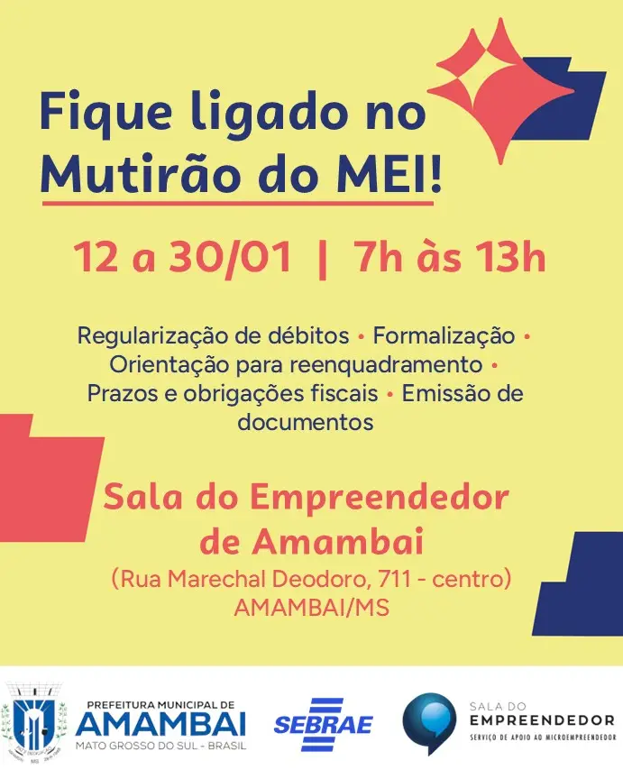 A Prefeitura de Amambai, por meio da Sala do Empreendedor, realiza entre os dias 12 e 30 de janeiro o Mutirão de Reenquadramento do Microempreendedor Individual (MEI). A ação acontece de segunda a sexta-feira, das 7h às 13h, com atendimento gratuito aos empreendedores do município.