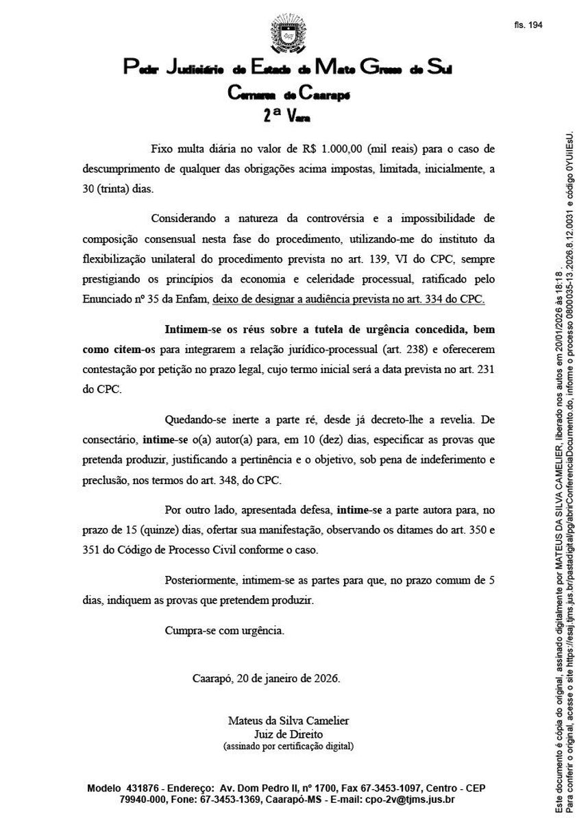A decisão foi proferida pelo juiz Mateus da Silva Camelier, da 2ª Vara da Comarca de Caarapó, no âmbito do Processo nº 0800035-13.2026.8.12.0031, que trata de Ação de Obrigação de Fazer com pedido de Tutela de Urgência.