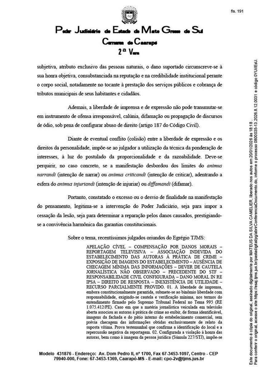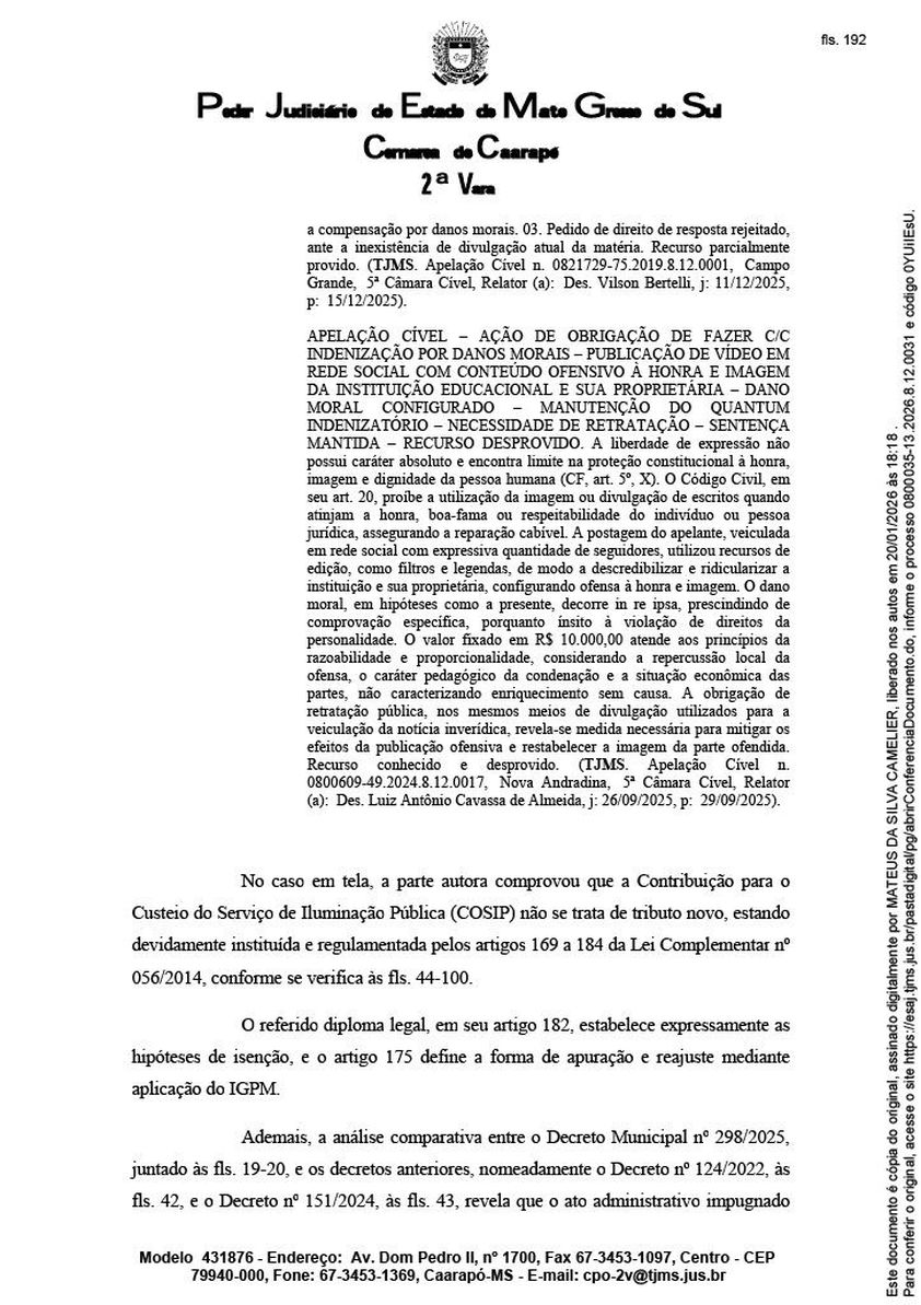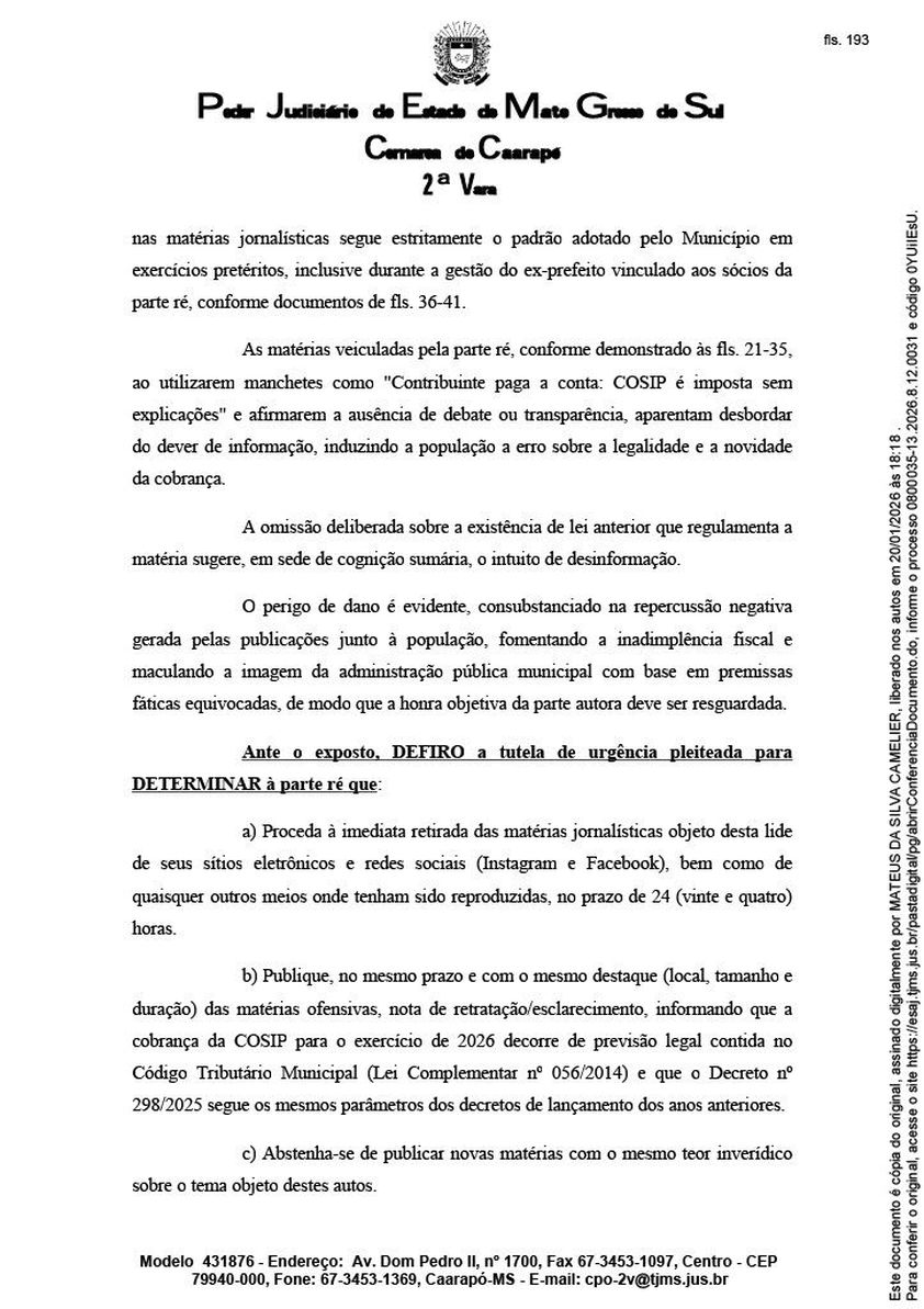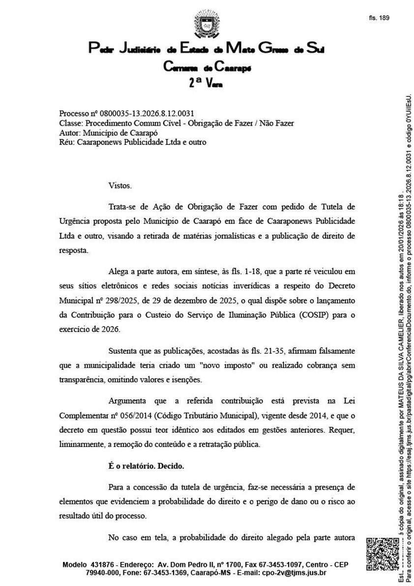 O Poder Judiciário de Mato Grosso do Sul tornou ré a empresa Caaraponews Publicidade Ltda em ação movida pelo Município de Caarapó, que questiona matérias publicadas pelo site sobre a cobrança da Contribuição para o Custeio do Serviço de Iluminação Pública (COSIP) para o exercício de 2026.
