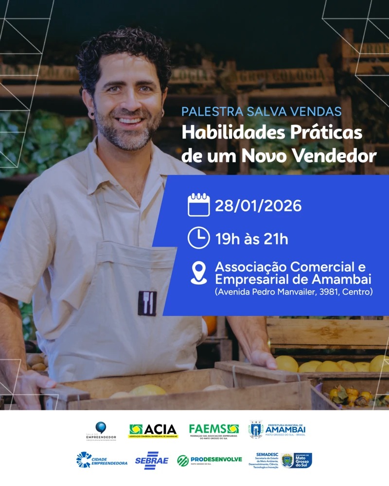 Amambai recebe, no próximo dia 28 de janeiro, uma importante ação voltada à qualificação profissional na área de vendas. A palestra gratuita “Salva Vendas – Habilidades Práticas de Um Novo Vendedor” será realizada das 19h às 21h, na Associação Comercial e Empresarial de Amambai (ACIA), e tem como público-alvo novos vendedores e pessoas que desejam aprimorar suas técnicas comerciais.
