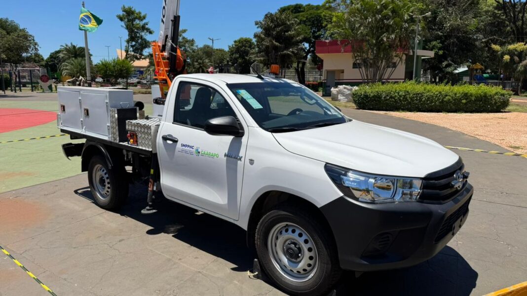 A Prefeitura Municipal de Caarapó realizou a entrega de um veículo tipo caminhonete com cesto aéreo isolado, totalmente equipado para atender às demandas da Secretaria Municipal de Planejamento, Projetos, Habitação e Controle Urbano, especialmente nos serviços de manutenção da rede de iluminação pública do município.