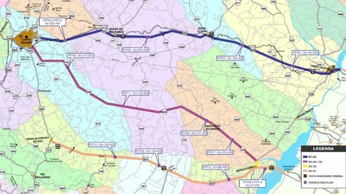 Além da BR-262, a concessão inclui pedágios em outras vias estratégicas. Na MS-040, entre Campo Grande e Santa Rita do Pardo, o valor total será de R$ 41,20, distribuído em três pórticos. Na MS-338, entre Santa Rita do Pardo e Bataguassu, haverá um ponto de cobrança com tarifa de R$ 10,40. Já na BR-267, o custo total para automóveis será de R$ 43,70, somando quatro pórticos entre a divisa com São Paulo, Bataguassu, Casa Verde e Nova Alvorada do Sul.
