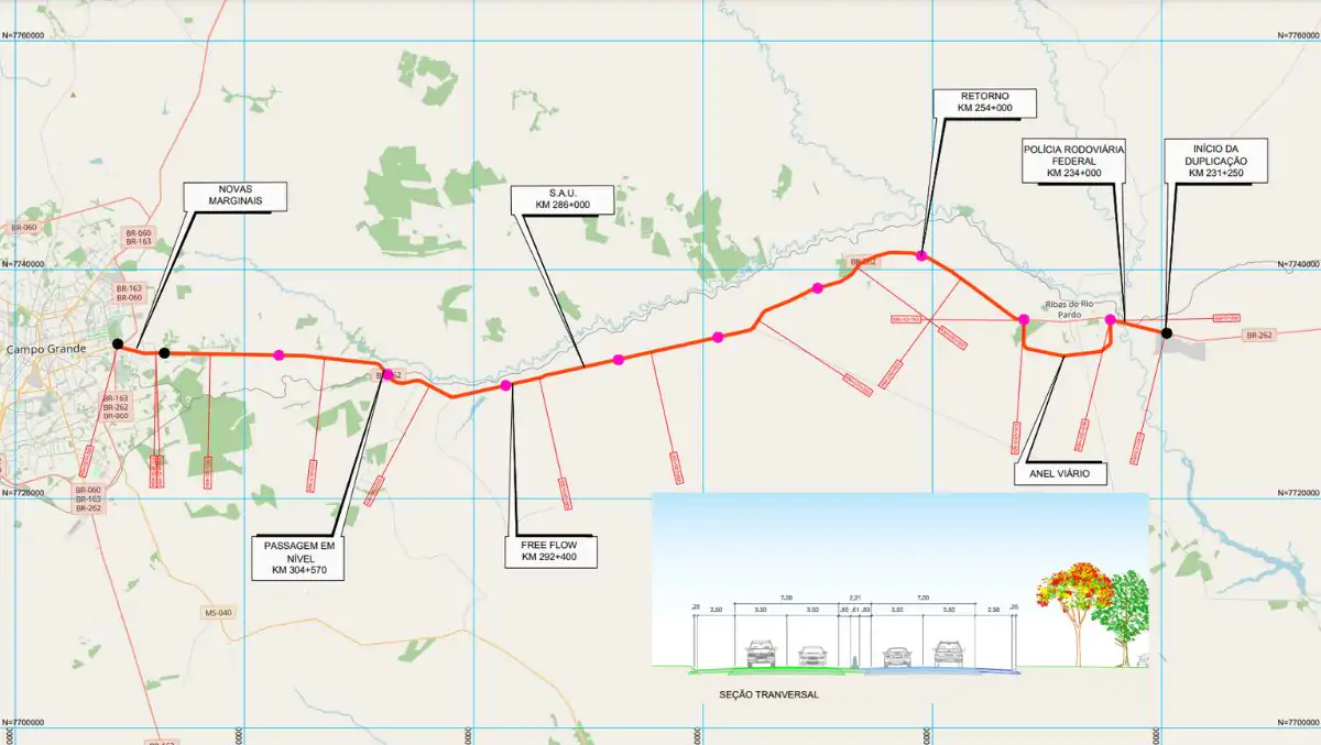 Ao todo, a concessão abrange 870,3 quilômetros de rodovias na região leste de Mato Grosso do Sul, incluindo trechos das BRs 262 e 267 e das rodovias estaduais MS-040, MS-338 e MS-395. A BR-262, que liga Campo Grande a Três Lagoas, terá 101,73 quilômetros duplicados entre a Capital e Ribas do Rio Pardo, além de terceiras faixas e acostamentos em outros trechos.