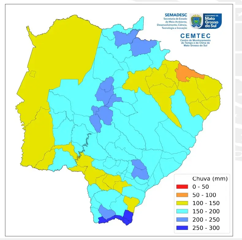 O maior volume de chuva foi observado no município de Mundo Novo, com um total acumulado de 439 milímetros, o que representa um 144% acima da média climatológica do período. Em Campo Grande, o acumulado de chuvas para o mês de dezembro ficou acima da média histórica nos cinco pontos de monitoramento, com percentuais que variaram de 18% a 40%, dependendo da região.