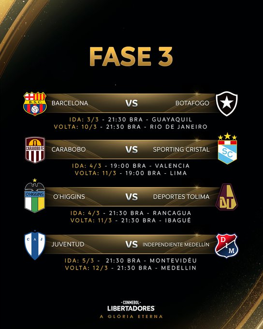 O Botafogo conheceu nesta sexta-feira (27) as datas e horários dos seus jogos contra o Barcelona de Guayaquil (Equador) na terceira fase prévia da Copa Libertadores da América. A informação foi anunciada pela Conmebol (Confederação Sul-Americana de Futebol).Conmebol anuncia datas e horários da 3ª fase prévia da LibertadoresConmebol anuncia datas e horários da 3ª fase prévia da Libertadores