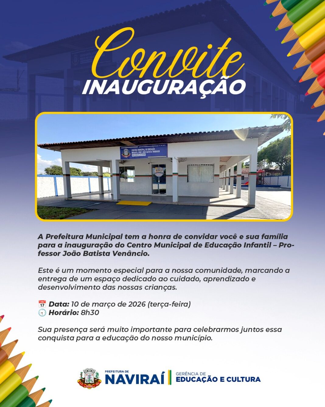 A Prefeitura de Naviraí realiza nesta terça-feira, dia 10 de março, a inauguração do Centro Municipal de Educação Infantil (CMEI) Professor João Batista Venâncio. A cerimônia está marcada para as 8h30 e contará com a presença de autoridades e da comunidade.