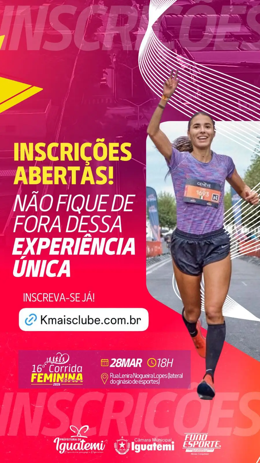 No próximo sábado (28), na Praça João Francisco Lopes, com início às 18h, será realizada a 16ª edição da “Corrida Feminina” em Iguatemi. A corrida, tradicional na região, foi idealizada pela vereadora Mirian Krenczynski, que também é responsável pela organização, e conta com apoio da Prefeitura Municipal, Câmara de Vereadores e da Fundesporte.