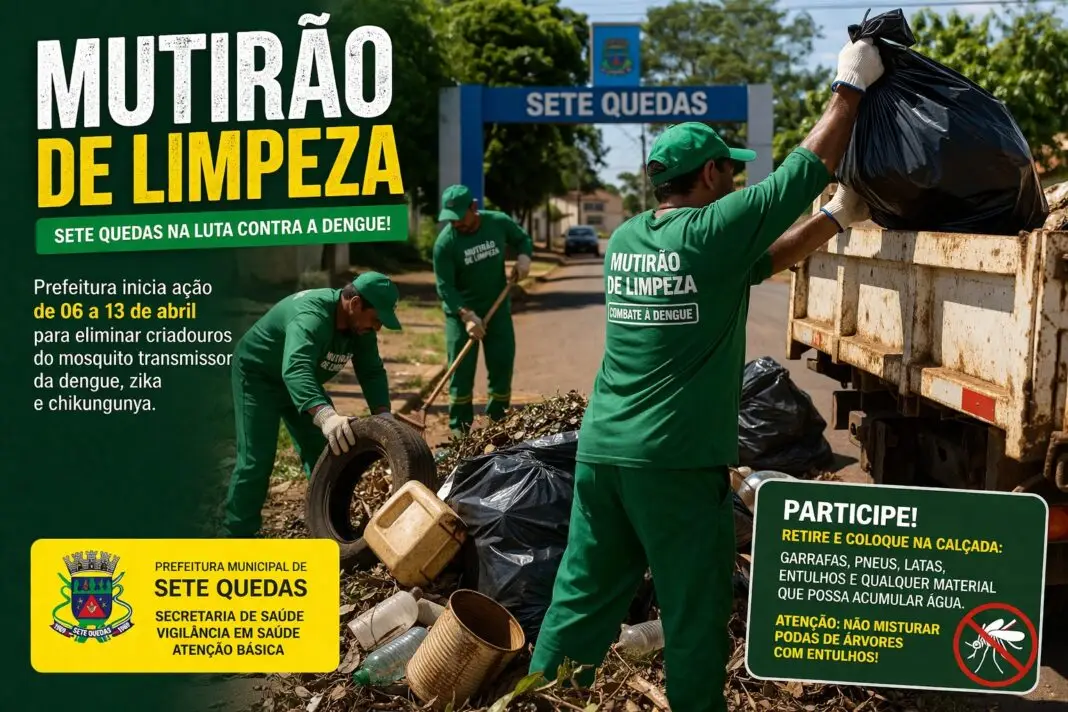 A Prefeitura de Sete Quedas dá início nesta segunda-feira, 6 de abril, a um grande mutirão de limpeza com foco no combate ao mosquito transmissor de doenças como Dengue, Zika e Chikungunya. A ação acontece entre até o dia 13 de abril e mobiliza diferentes setores da administração municipal, especialmente a Secretaria de Saúde, Vigilância em Saúde e Atenção Básica.