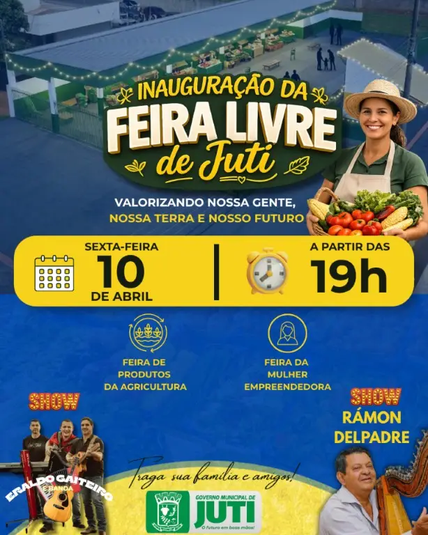 A Prefeitura de Juti realiza, nesta sexta-feira (10), a partir das 19h, a inauguração da Feira Livre Municipal, um novo espaço dedicado à valorização da agricultura familiar, ao incentivo ao empreendedorismo e ao fortalecimento da economia local.