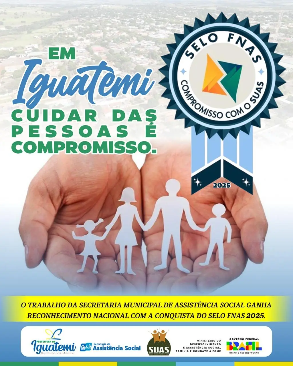 Cuidar das pessoas é compromisso. E esse compromisso gera reconhecimento. A Prefeitura Municipal de Iguatemi foi contemplada com o Selo FNAS — Edição 2025, reconhecendo a excelência no atendimento aos critérios estabelecidos no financiamento da política pública de Assistência Social. Esse reconhecimento destaca o compromisso da gestão com a qualidade do serviço do CRAS e a dedicação em cuidar de cada cidadão.
