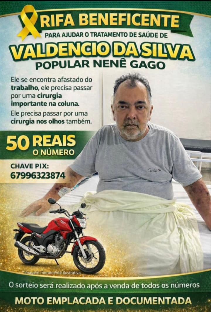 Uma rifa beneficente está sendo realizada para auxiliar no tratamento de saúde de Valdencio da Silva, popularmente conhecido como Nenê Gago, morador de Aral Moreira. Conforme as informações divulgadas, ele está afastado do trabalho e precisa passar por uma cirurgia importante na coluna, além de um procedimento nos olhos.