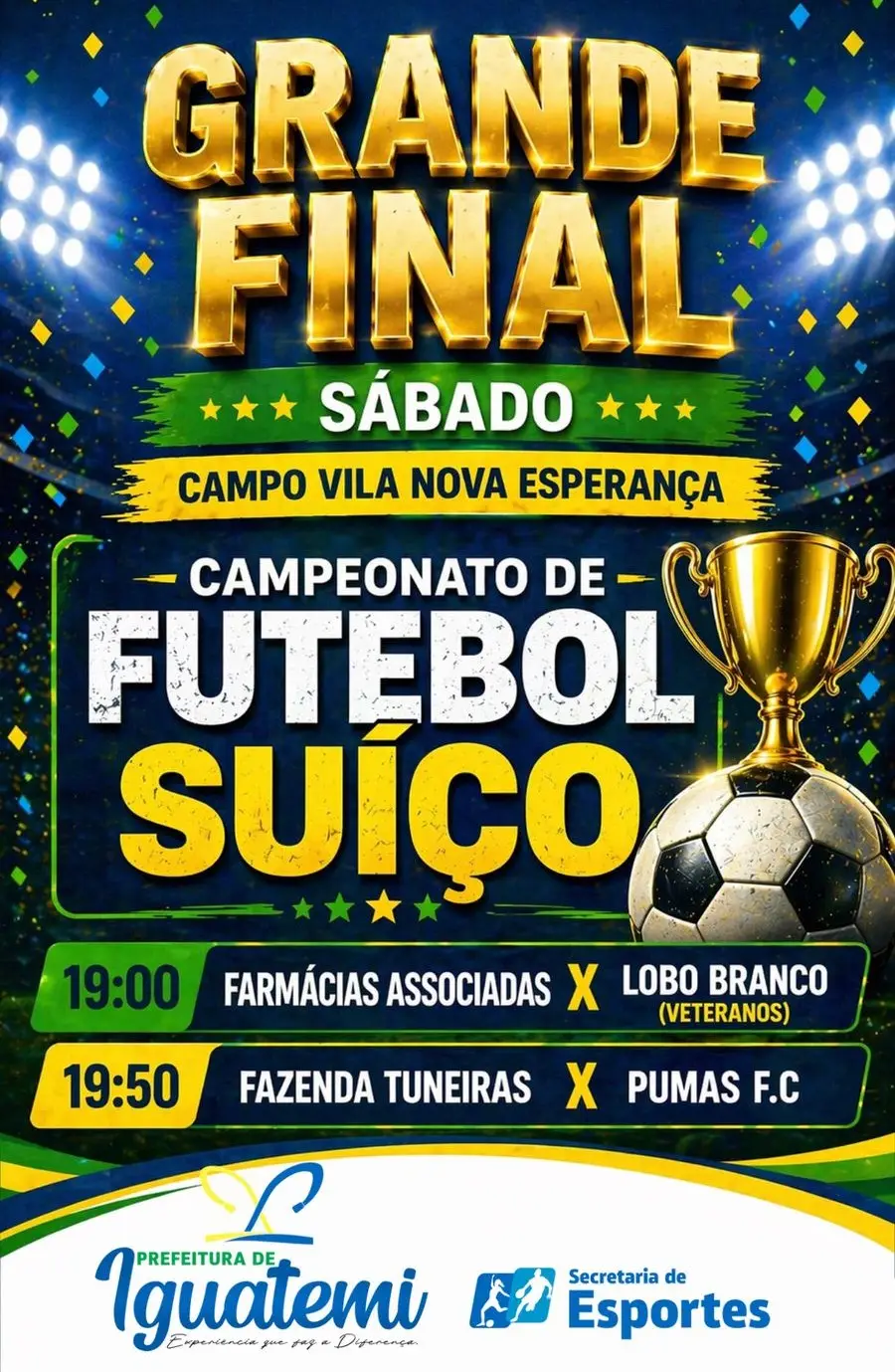 A noite deste sábado, dia 25 de abril, será de decisões do Campeonato Municipal de Futebol Suíço 2026. Os jogos acontecem no campo da Associação Vila Nova Esperança, a partir das 19h, reunindo as equipes finalistas da competição. A competição contou com a participação de 14 equipes, sendo 08 na categoria Adulto Livre e 06 na categoria Veteranos. A Secretaria Municipal de Esportes foi a organizadora do campeonato e contou com total apoio da Prefeitura de Iguatemi.