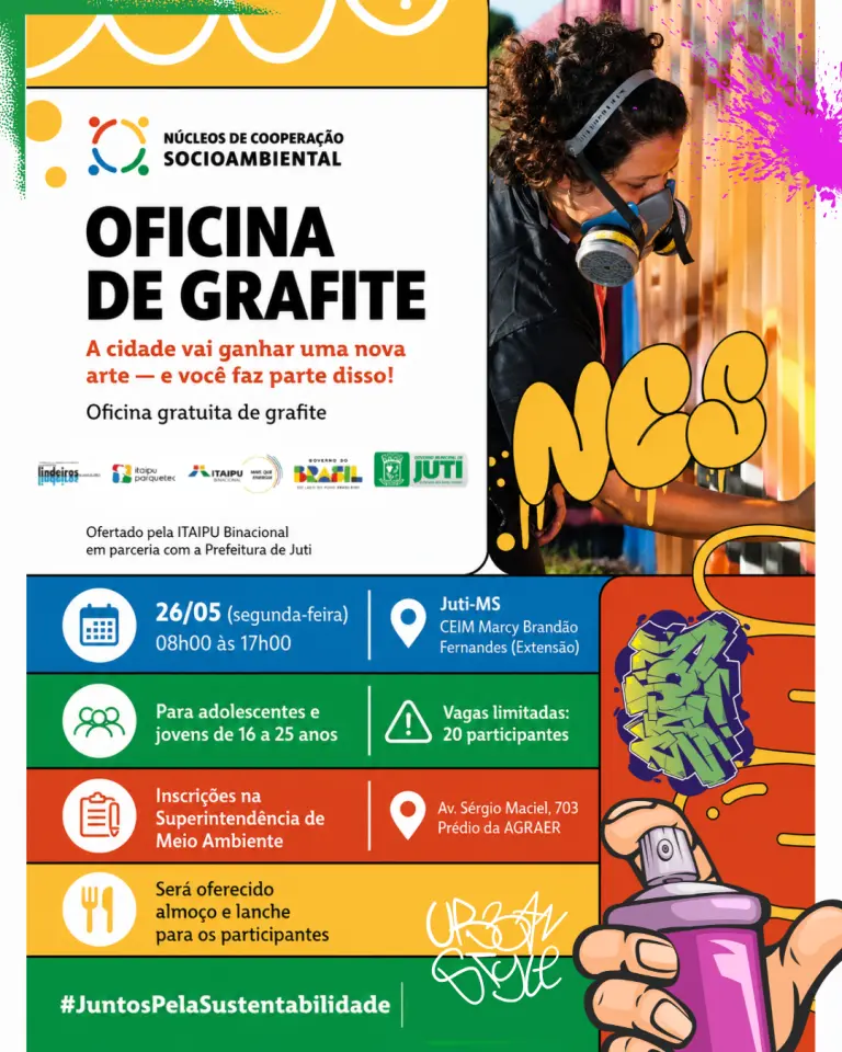 A Prefeitura de Juti, por meio da Superintendência de Meio Ambiente, em parceria com a Itaipu Binacional, está com inscrições abertas para a Oficina de Grafite, uma iniciativa voltada à promoção da arte urbana, educação ambiental e inclusão social.