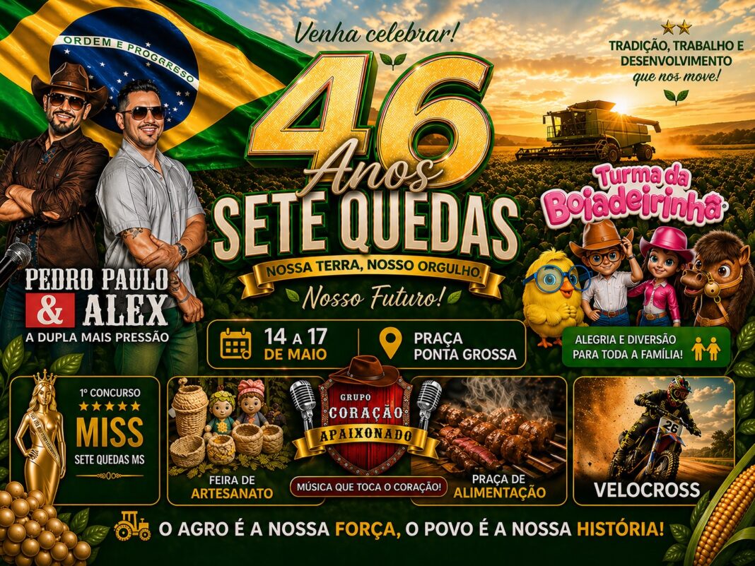 O município de Sete Quedas se prepara para celebrar seus 46 anos de emancipação político-administrativa com uma programação diversificada entre os dias 14 e 17 de maio, reunindo cultura, entretenimento e atividades para toda a família.