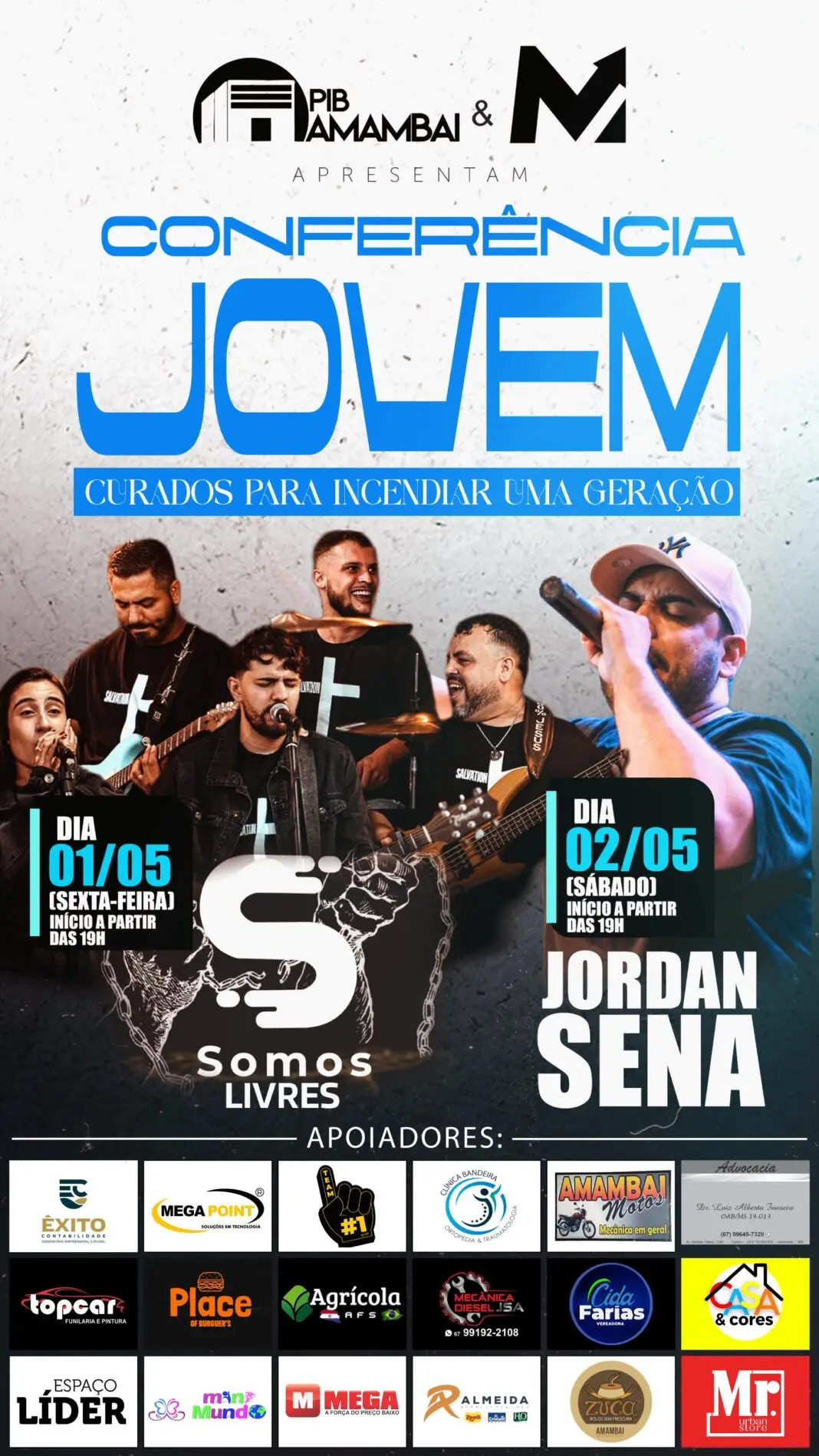 A Conferência Jovem acontecerá nesta sexta-feira e sábado, dias 1º e 2 de maio, às 19h, na Primeira Igreja Batista de Amambai. No primeiro dia, haverá a presença da banda gospel Somos Livres, de Dourados, e, no segundo dia, estará presente o cantor Jordan Sena, de São Paulo.