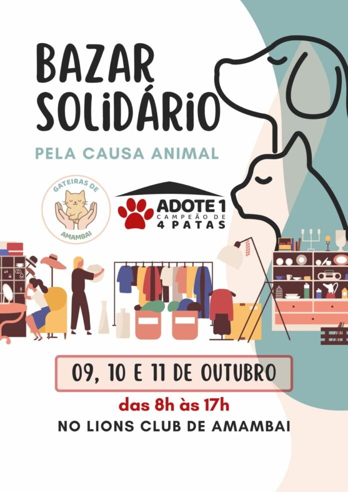 Com o objetivo de arrecadar recursos para continuar o trabalho de resgate e cuidado com animais em situação de vulnerabilidade, a ONG Adote Um Campeão de 4 Patas e o grupo das Gateiras de Amambai promovem o Bazar Solidário pela Causa Animal, que acontece nos dias 9, 10 e 11 de outubro, das 8h às 17h, no Lions Club de Amambai.