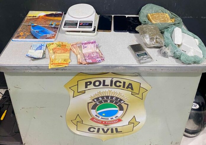 Em dois imóveis vinculados ao suspeito S.O.C. (30), sendo um no Condomínio Nelson Trad e outro no Bairro Vila Nova, foram apreendidos 21,33gr de crack, 2,92gr de maconha, balança de precisão, dinheiro fracionado, anotações do tráfico, celulares, rádio comunicador e câmeras de segurança, indicando atividade habitual de distribuição e controle de pontos de venda de drogas.