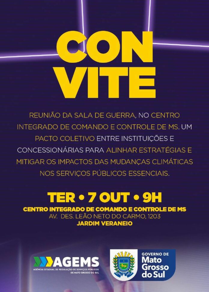 Na próxima terça-feira (07), às 9h, o Centro Integrado de Comando e Controle de Mato Grosso do Sul será palco de uma reunião da Sala de Guerra, grupo de gestão de crises criado pela Agência Estadual de Regulação para monitorar e mitigar os impactos das mudanças climáticas em serviços públicos essenciais.