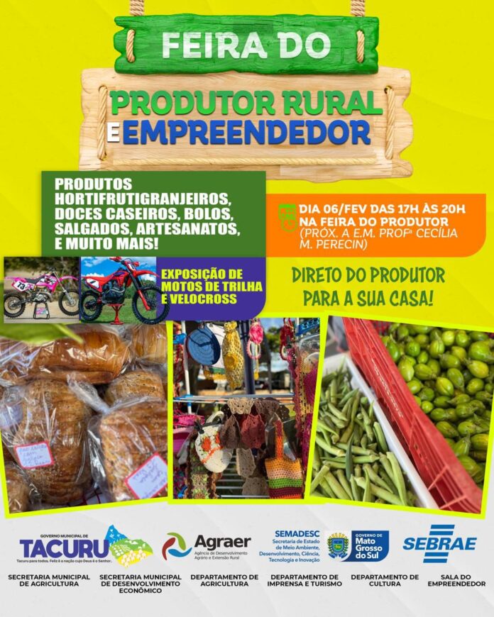 A Feira do Produtor Rural e Empreendedor será realizada nesta sexta-feira, dia 6 de fevereiro, em Tacuru. O evento acontece das 17h às 20h, na Feira do Produtor, localizada próxima à Escola Municipal Professora Cecília Mutsumi Honda Perecin.