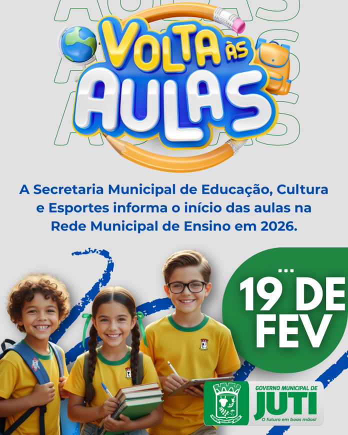 A Secretaria Municipal de Educação, Cultura e Esportes (SEMECE) informa que o ano letivo de 2026 na Rede Municipal de Ensino de Juti terá início no dia 19 de fevereiro. As unidades escolares do município estão sendo preparadas para receber os alunos com organização, planejamento pedagógico e estrutura adequada.