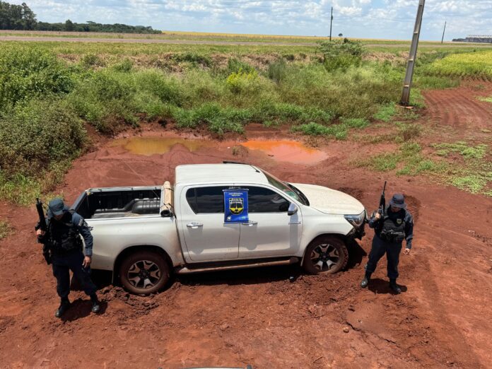 Por volta das 11h, os policiais localizaram uma caminhonete Toyota Hilux, de cor branca, atolada em uma lavoura às margens da rodovia. Após consulta aos sistemas policiais, foi constatado que o veículo possuía registro de furto ocorrido na madrugada do mesmo dia, no município de Caarapó/MS.