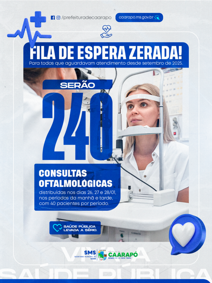 A Prefeitura de Caarapó reafirma seu compromisso com a saúde pública ao promover uma importante ação para eliminar a fila de espera por consultas oftalmológicas no Pronto Atendimento Municipal (PAM). Nos dias 26, 27 e 28 de janeiro, serão realizados 240 atendimentos, contemplando todos os pacientes que aguardavam consulta desde setembro de 2025.