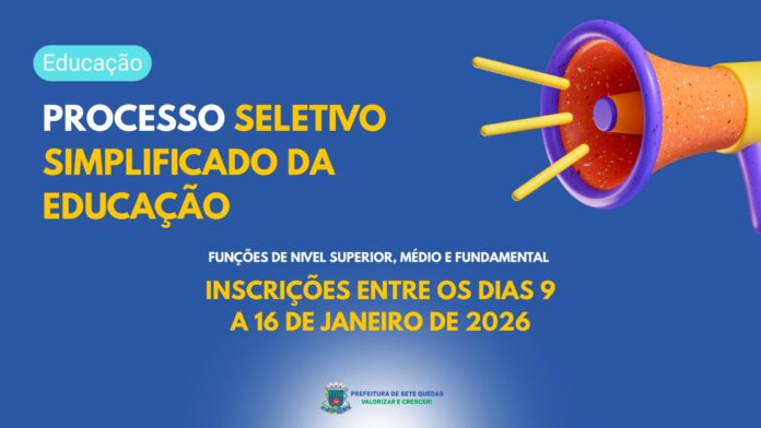 A Prefeitura Municipal de Sete Quedas, por meio da Secretaria Municipal de Educação, está com inscrições abertas para o Processo Seletivo Simplificado (PSS) destinado à contratação temporária de profissionais para a rede municipal de ensino. O período de inscrição vai de 9 a 16 de janeiro de 2026, sem cobrança de taxa.