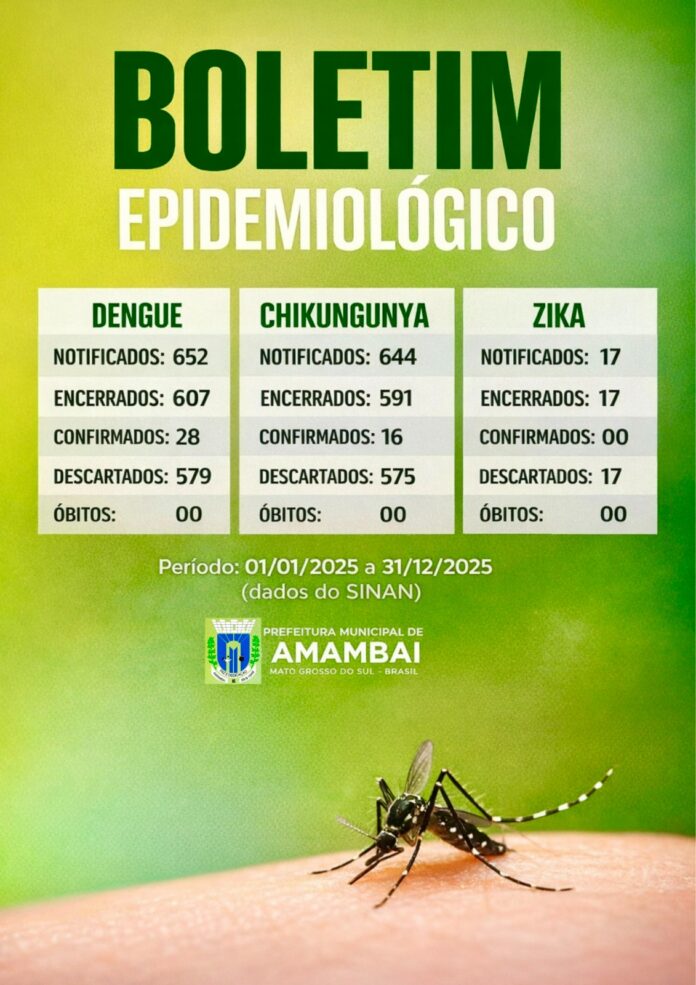 A Prefeitura de Amambai, por meio da Secretaria Municipal de Saúde, divulgou o boletim epidemiológico das arboviroses — dengue, chikungunya e zika — referente ao período de 1º de janeiro a 31 de dezembro de 2025, com base em dados do Sistema de Informação de Agravos de Notificação (SINAN).