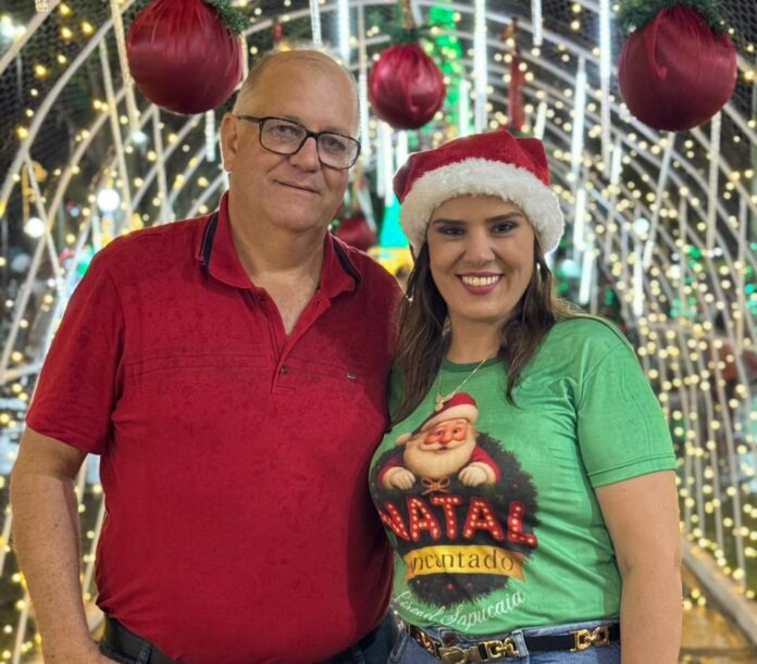 Prefeita Niágara Kraievski e o vice-prefeito Carlos Magno Fernandes durante o acendimento das luzes de Natal, em Coronel Sapucaia, evento integrado ao calendário de aniversário do município. Fotos e vídeos: Divulgação/Prefeitura
