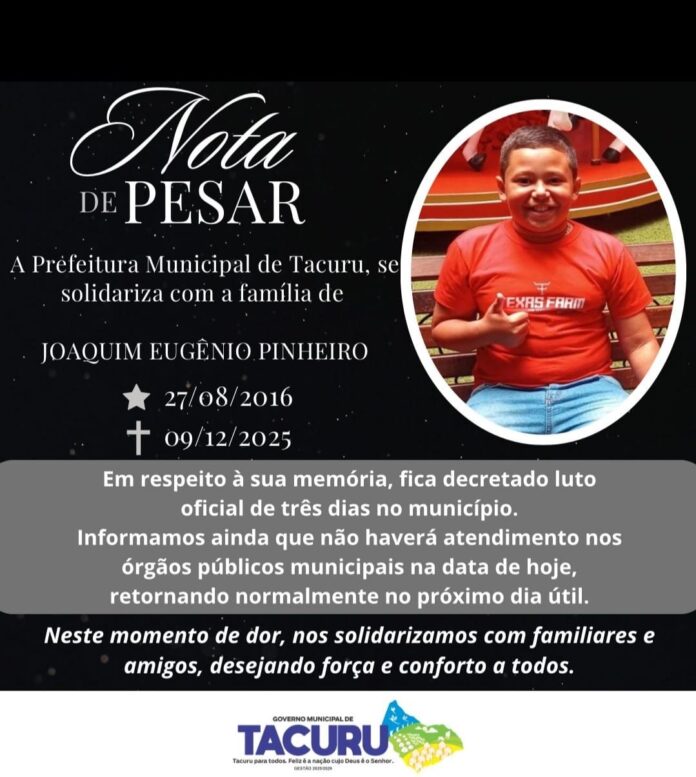 A Prefeitura de Tacuru divulgou uma nota de pesar pelo falecimento nesta terça-feira (9) de Joaquim Eugênio Pinheiro, de 9 anos.