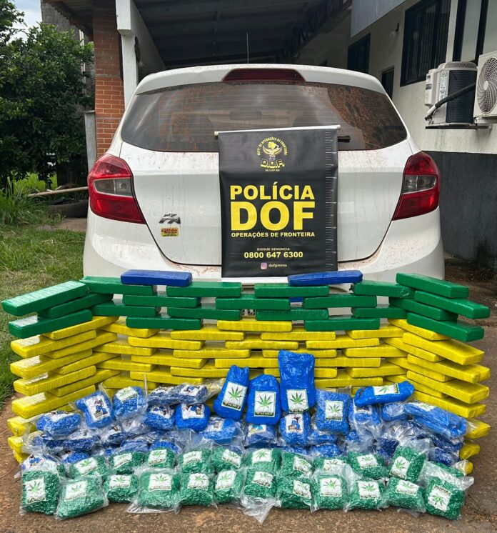 Policiais militares do DOF (Departamento de Operações de Fronteira) apreenderam, nesta segunda-feira (23), em Tacuru, 100 quilos de maconha e 22 quilos de skunk que eram transportados em um veículo Ford Ka. Na ação, um homem de 36 anos foi preso e uma adolescente, de 17 anos, apreendida.