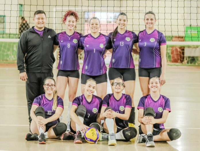 A equipe feminina de Aral Moreira na Copa Conesul de Vôlei 2025. (Em pé da esquerda pra direita) o técnico, professor Tiago, Brenda, Denise Bonkoski, Vívian, Denize Oliveira. (sentadas) Iara, Maria Izabel, Júlia Ramiro, Júlia Oliveira. Elas vão enfrentar Naviraí em uma das semifinais. (Fotos: Divulgação)