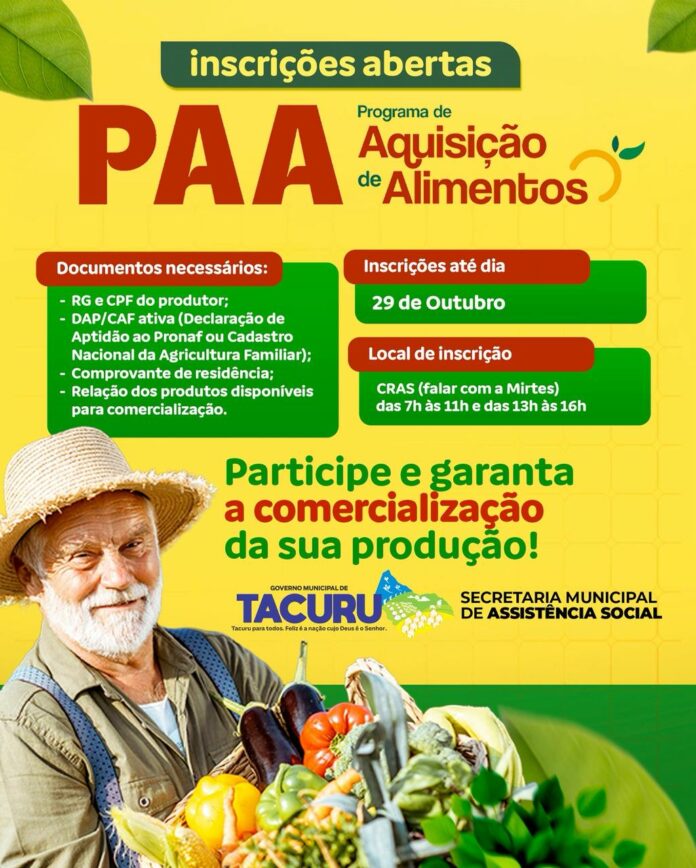 A Secretaria Municipal de Assistência Social de Tacuru informa que estão abertas as inscrições para o Programa de Aquisição de Alimentos (PAA). A iniciativa tem como objetivo incentivar a agricultura familiar, garantindo aos produtores locais a oportunidade de comercializar seus produtos de forma direta e justa.