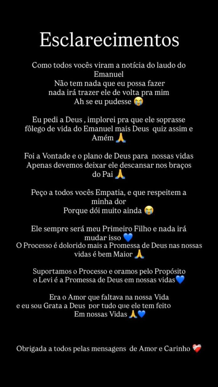 Com a conclusão do inquérito policial baseado principalmente nos laudos técnicos apresentados, os pais do bebê Emanuel Tobias Marques, que veio a óbito em janeiro desse ano, se manifestaram nas redes sociais e também através de contato com o jornal A Gazeta.