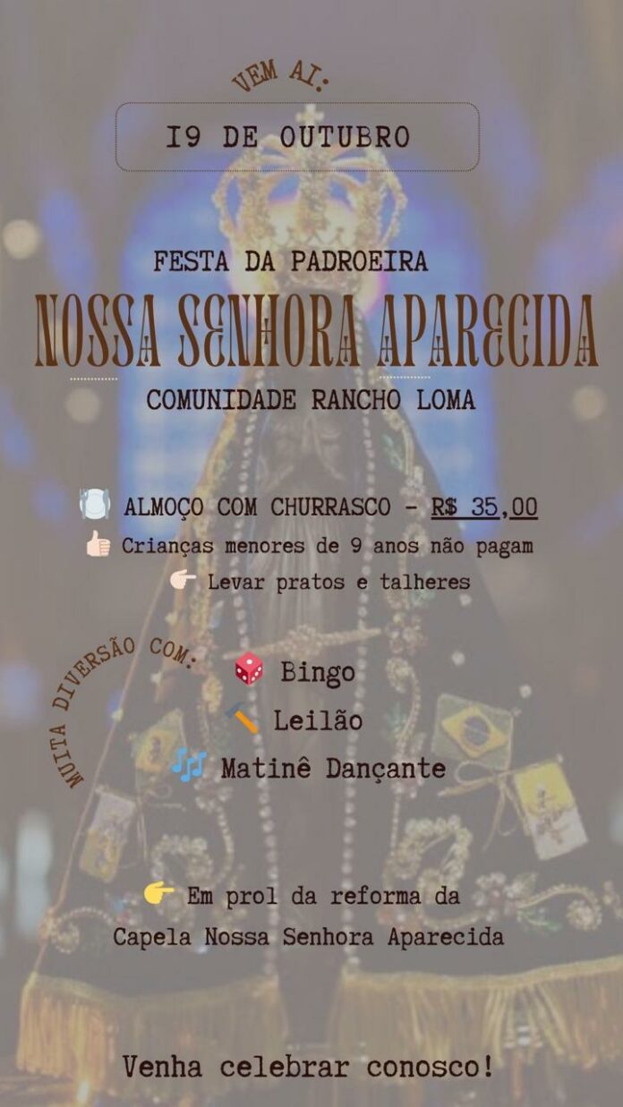 No próximo domingo dia 19 de outubro, em comemoração ao dia de Nossa Senhora Aparecida, padroeira do Assentamento Rancho Loma, a comunidade estará promovendo uma grandiosa festa em prol da reforma da Capela que leva o mesmo nome. Na programação, Almoço com churrasco, Bingo, Leilão e muita diversão.